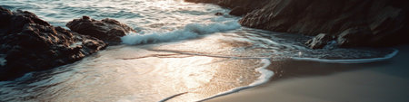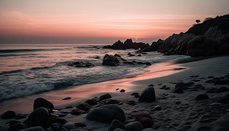 Sunset over the tranquil coastline, waves crashing on rocky cliffs generated by artificial intelligence