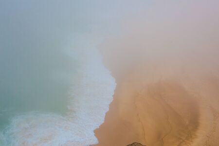 Sea and sandy beach in dense fog, autumn day. Foggy weather at Nazare Portugal. Atlantic ocean top view from observation deck