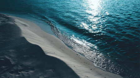 A breathtaking aerial view of an untouched beach showcasing soft sands and dancing ocean waves illuminated by bright sunlight, creating a tranquil atmosphere.