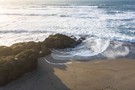 A stunning high angle view of a powerful ocean swell with white foam hitting a sandy shore under a beautiful pastel colored sky at dusk or dawn.