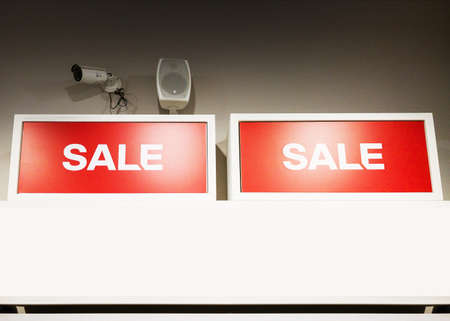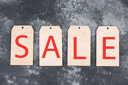 Close-up of red Sale tags stacking on table, modern labels for shops and stores