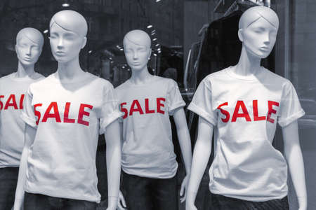 Female mannequin near sign with discount inscription SALE 60 in a clothing store.