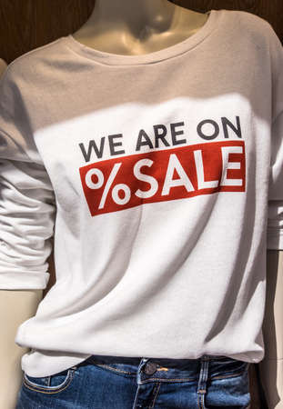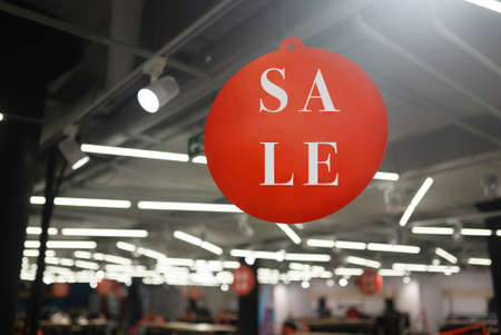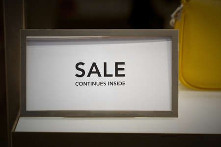 Sale label sign in front of shop, against the background of a clothing store. The concept of seasonal sales and discounts