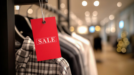 Red sale tag hanging in retail clothing store, close-up. Discounts and promotions in shopping malls, seasonal clothing sales. Black Friday