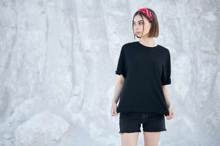 Sexy woman or girl wearing black blank t-shirt with space for your logo, mock up or design outdoors