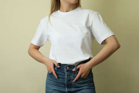 Young woman in blank t-shirt against beige background