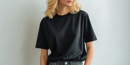 Woman or girl wearing black blank cotton t-shirt with space for your logo, mock up or design in casual urban style