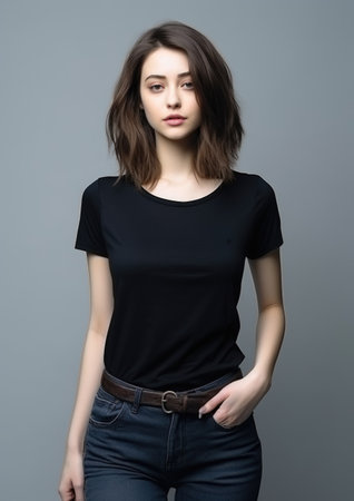 Young woman in black tee and jeans against gray background.
