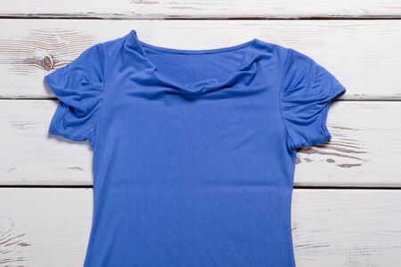 Blue top with crumpled sleeves. Blue t-shirt on wooden background. Casual garment of quality material. Summer top on sale.