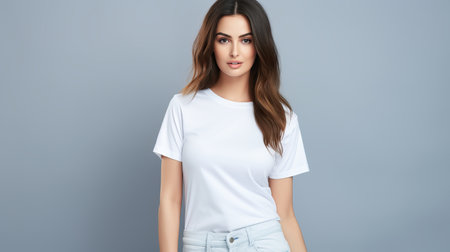 Woman standing against a plain white background, presenting a blank white t-shirt, ideal for showcasing apparel designs, branding, and minimalist fashion concepts on clothing