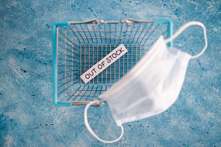 out of stock text inside of empty shopping basket with surgical mask, concept of supply chain shortages and delays after the covid-19 global pandemic
