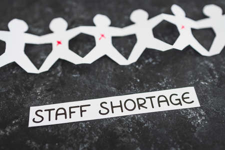 staff shortages and business struggling after the pandemic conceptual image, paper people chain with some workers crossed out and Covid Staff Shortage text on black background