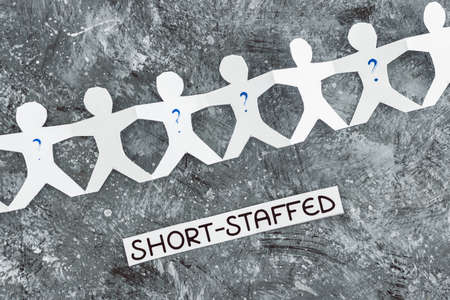 staff shortages and business struggling after the pandemic conceptual image, paper people chain with question marks on some workers and Short-staffed text on black background