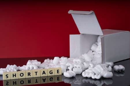 Business concept. Layout of packing peanuts, box and plastic tiles with text SHORTAGE.