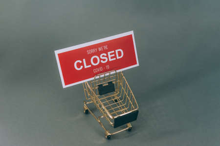 Red plate Sorry We're Closed COVID-19 with a supermarket trolley on gray background