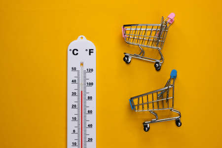 summer shopping. Seasonal hot deals. Shopping trolley with weather thermometer on yellow background. top view
