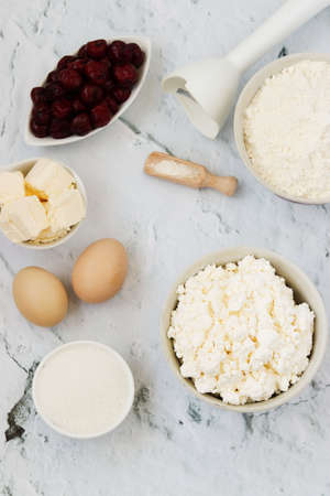 Ingredients for the preparation of cake with cherries: flour, baking powder, eggs, cottage cheese, butter, sugar and cherry