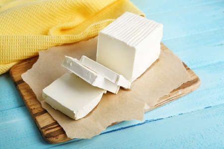 Piece of fresh butter for breakfast on kitchen table. White background. Top view