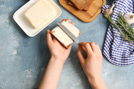 Female hand butters toasts for breakfast on the grey slate background. Horizontal view