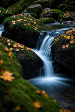 gentle waterfall flowing over colorful autumn leaves, created with generative ai