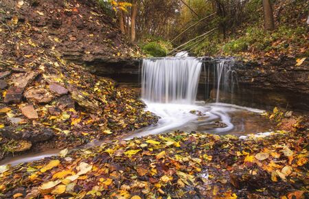 Waterfall green forest river stream landscape. Autumn time. Nature.