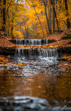 Golden leaves cascade onto a serene stream, reflecting the beauty of autumn.