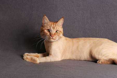 Grooming cat, Young fashionably trimmed ginger cat on gray background