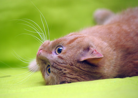 Gloomy ginger cat lies on the green background.
