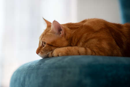 Beautiful young red tabby cat lying on blue chair at home