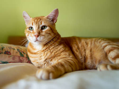Red cat sits on the bed and looks back. Shallow focus and blurred background. Copy space.