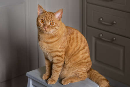 A large young red tabby cat sits on a stool among the kitchen furniture and looks at the camera. Charming cat at home. selective focus.