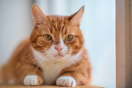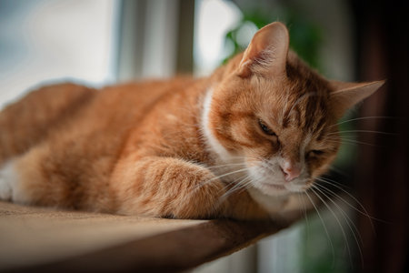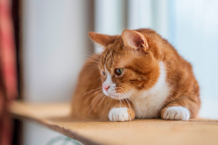 Young British Shorthair striped red cat sit on a windowsill and looks out the window at home, Domestic pet.