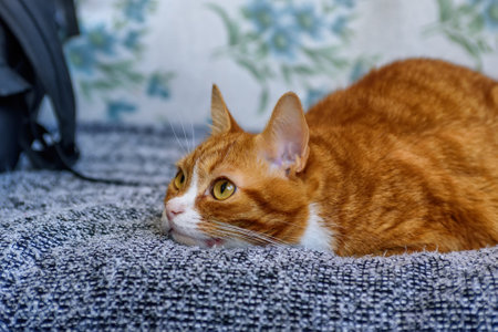 Close-up of an adult young cute tabby red cat lies with open eyes on the sofa in the room. Pet concept. selective focus.