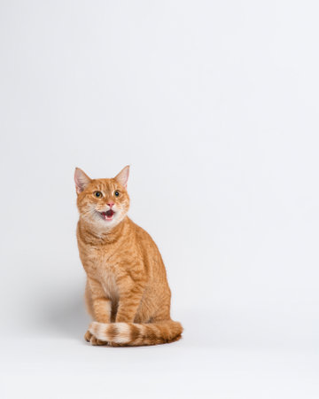 A striped red cat sits with tail resting on front paws and meows loudly. Portrait of a meowing cat on a white background in the studio. High quality vertical photo with copy space.