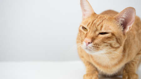 Orange cat. Portrait of tabby ginger cat over white background. Adorable pet posing at studio. Cute domestic animal.