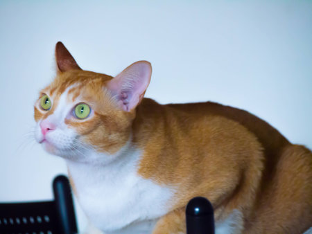 Ginger cute cat looking curiously on white background. Copyspace for your text. Adorable home pet stock photo