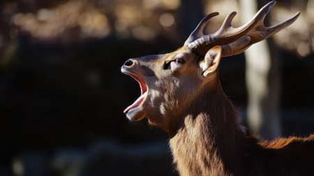 A deer with impressive antlers opens its mouth wide while vocalizing in a serene forest setting during bright daylight.