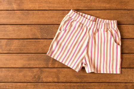 Funny shorts on wooden background . Children's clothes. The view from the top.