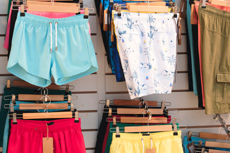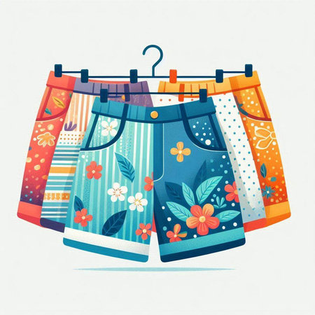 Colorful summer shorts hanging on a clothesline. Vector illustration.