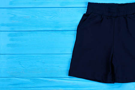 Kids dark cotton shorts and copy space. Toddler boy textile short pants on blue wooden background. Childs cotton summer garment.