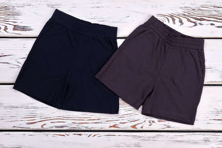 Black and grey kids shorts. Set of new casual shorts for boys on white wooden background. New collection of kids summer apparel.