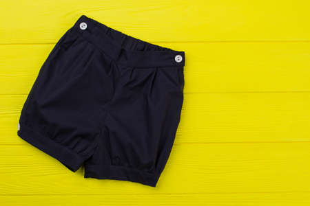 Navy shorts with white buttons. Bottom garment on yellow wooden background. Casual style for little ones.