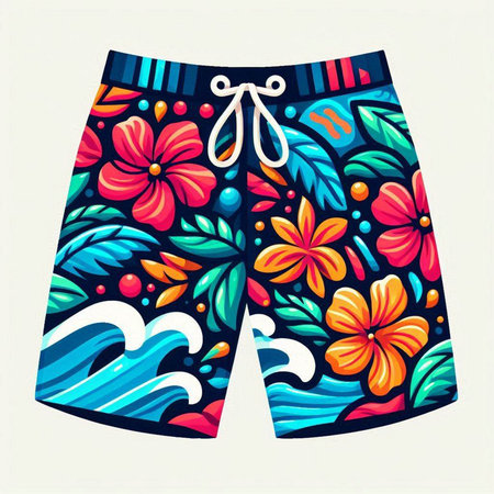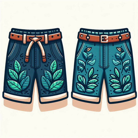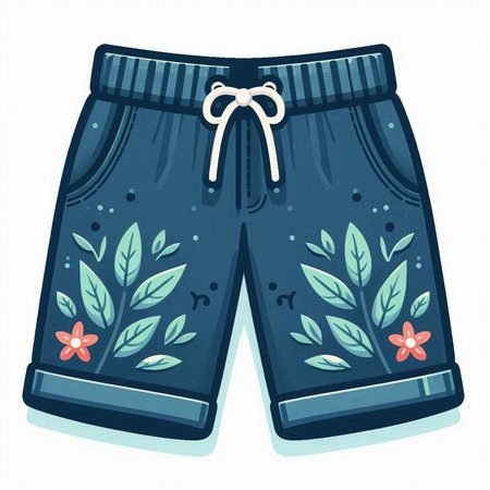 Vector illustration of a pair of shorts with a floral pattern and leaves.