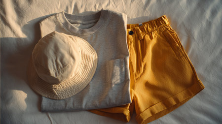 summer casual outfit flat lay, gray tee and yellow shorts with bucket hat, gentle warm light, minimalist cozy setup, fashion editorial style