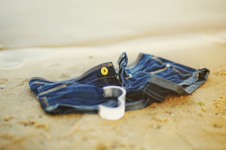 Lady's different length denim shorts. Different shorts on old table. Classic female shorts with keds. Black shoes and vintage shorts.