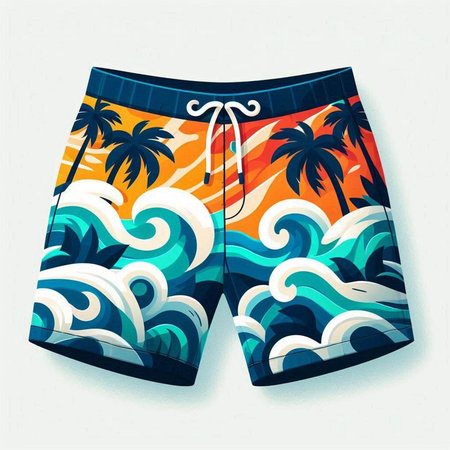 Vector illustration of summer swimming trunks with tropical palms and waves.