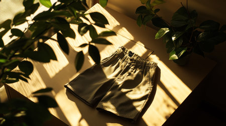 A pair of beige linen shorts neatly placed on a light wooden table, soft natural light illuminating the scene, HD quality --chaos 30 --ar 16:9 --v 6.1 Job ID: f2aaec95-8ee4-498a-9dc7-28d3bf4bc8da