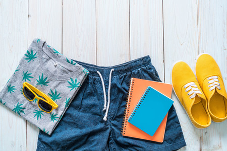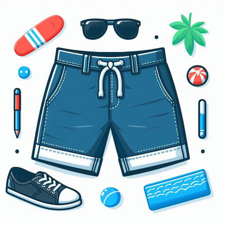 Vector illustration of men's summer clothing. Sunglasses, shorts, sneakers, skateboard, skateboard, surfboard, starfish, sunglasses.