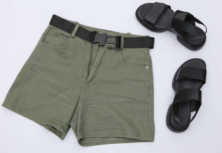Shorts and leather sandals on a white background. Women's clothing and accessories. top view. flat lay