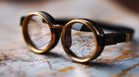A pair of vintage steampunk-style goggles with prominent gold-colored rims and dark frames, reflecting light and the intricate details of an old, unfolded map beneath them.